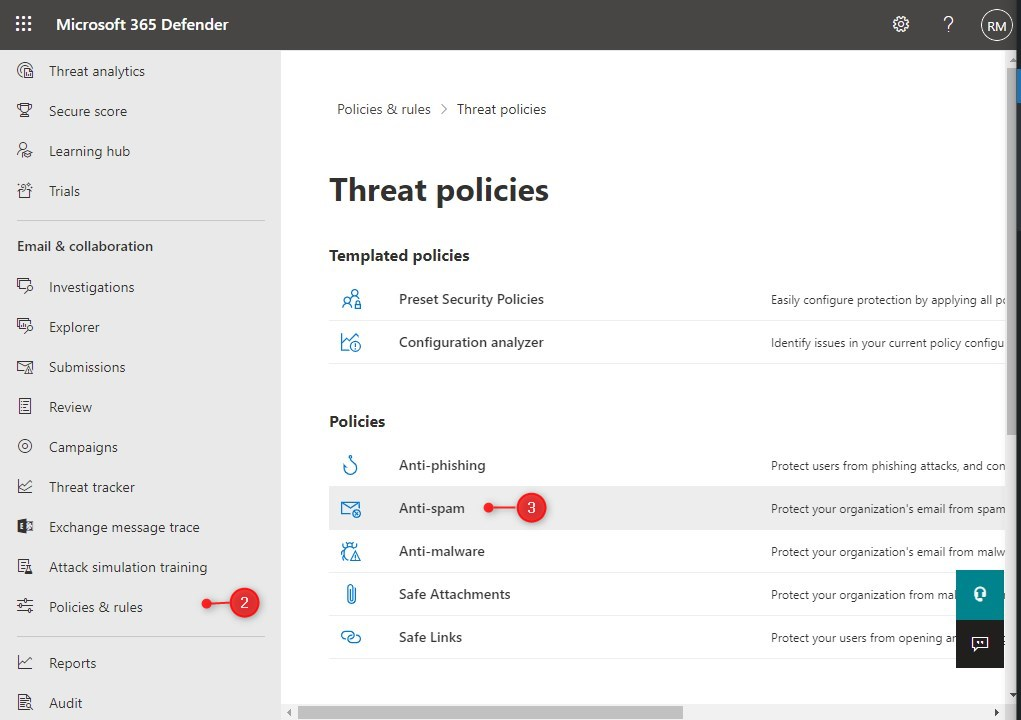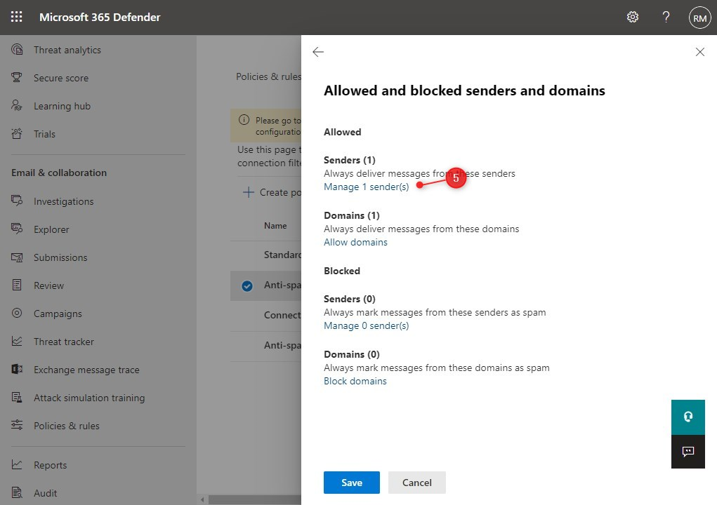 Det andra och enklare att implementera alternativet är att lägga till avsändaren i den tillåtna avsändarlistan i Office 365. För detta måste vi ändra anti-spam-policyn som du kan hitta Microsoft 365 Defender.